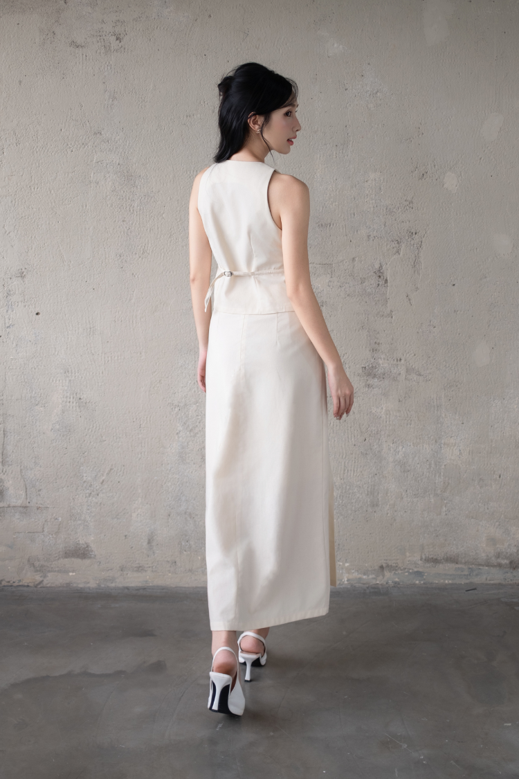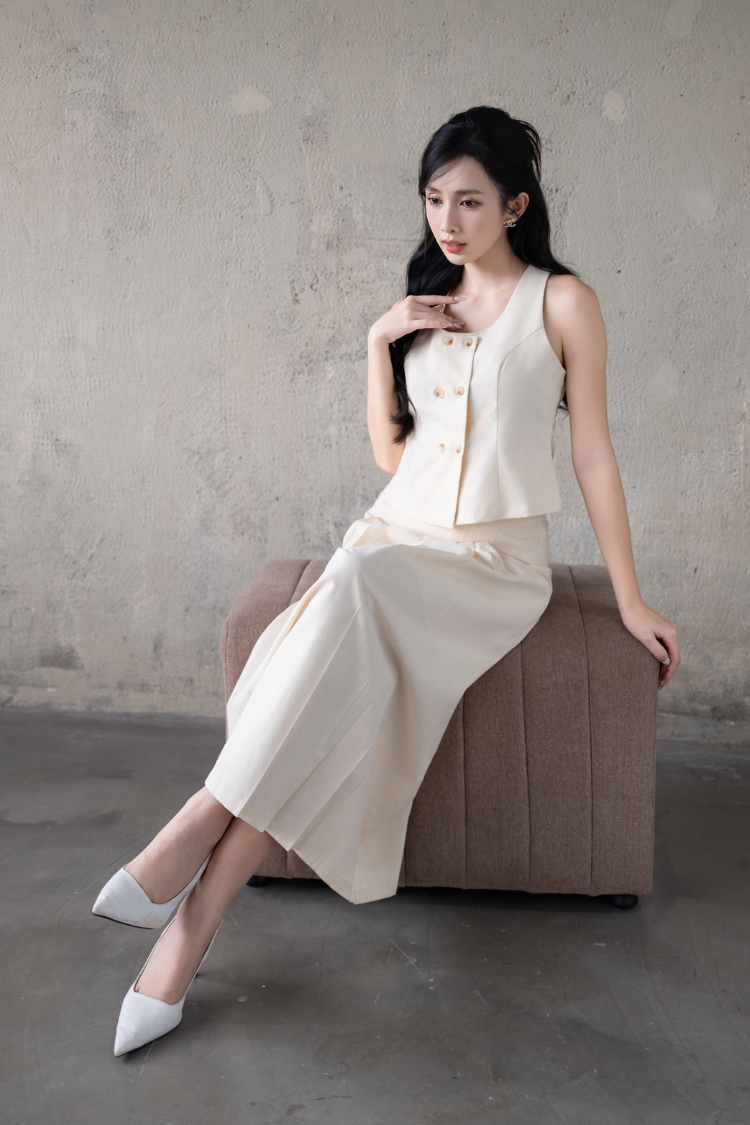 Chân váy dài xếp ly chữ A lưng cao tôn dáng.