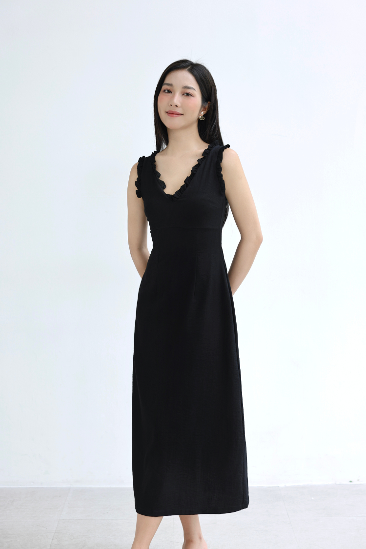Đầm dài maxi chữ A sát nách Linen thun phối bèo cổ V Sower – D03