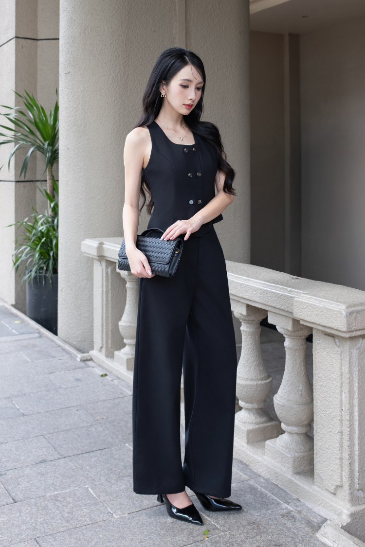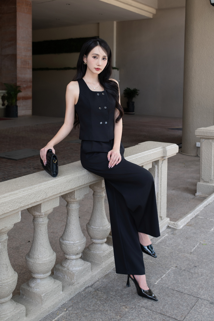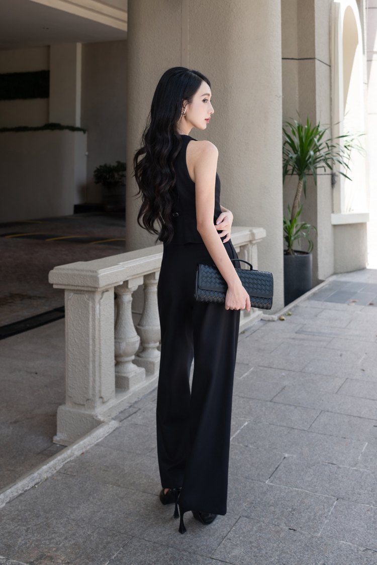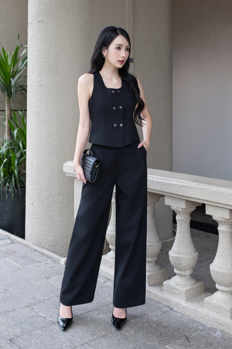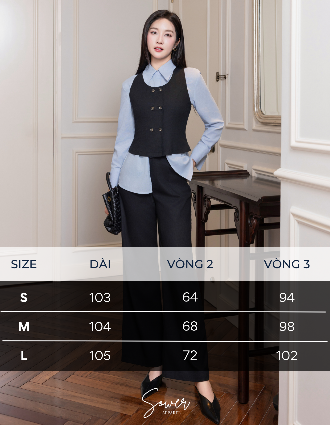 Lưng cao tôn dáng, kéo dài chân; ống suông rộng di chuyển thoải mái.
