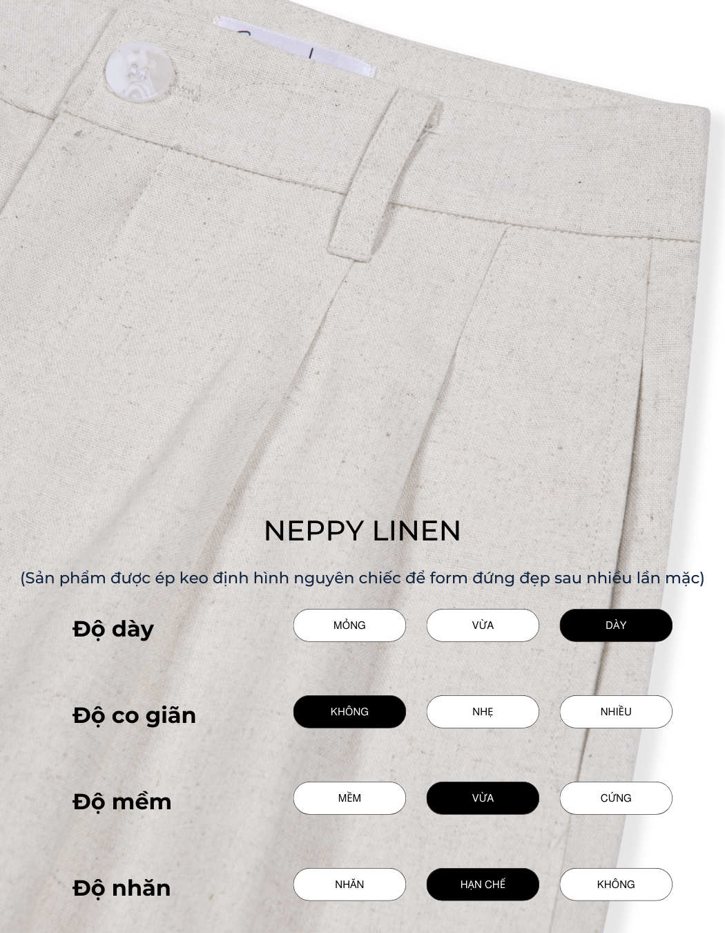 Nút xà cừ tinh tế, Neppy Linen thoáng mát, thân thiện da nhạy cảm.